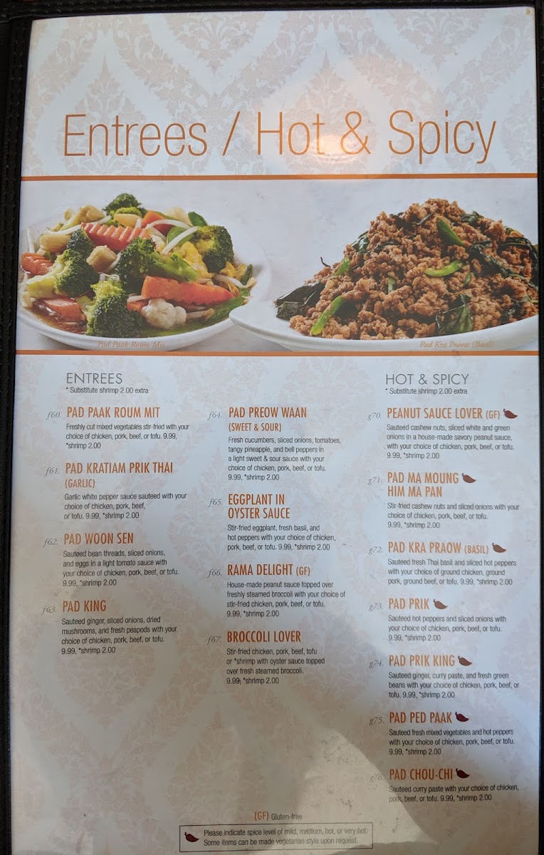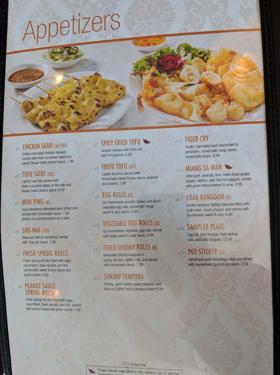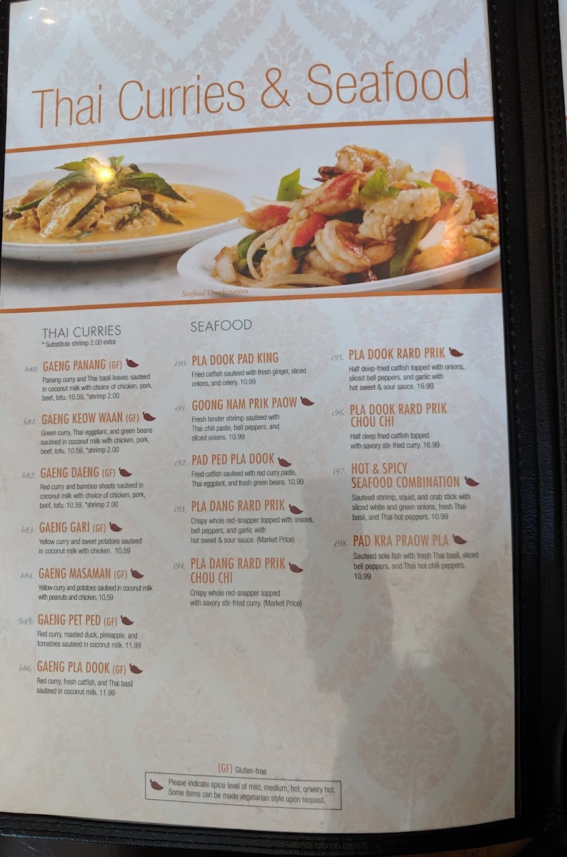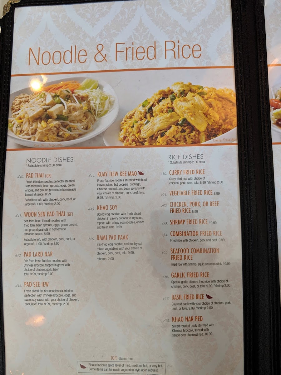 “ Very standard Thai Restaurant with decor, but it was very clean and the staff was friendly. The food was good and I love how they ask for the spice level prior I got a 5 out of 7 with hot sauce on the side. Could have asked for a 7 out of 7. The Thai Iced Tea was extra creamy but still a good amount of sweet. ”